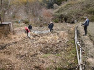 北谷では引き続き枯竹の焼却をしました。ため池の補修や、竹小屋の屋根材とするため、竹の伐採を進めました。