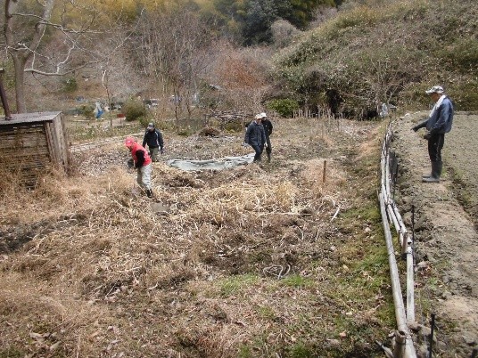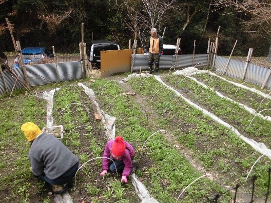 サツマイモ畑は次の作付けに向け、草取り及び耕運機かけを行いました。猪対策としては、板の上部から乗り越えられないよう、トタンの上にネットを張ることとしました。