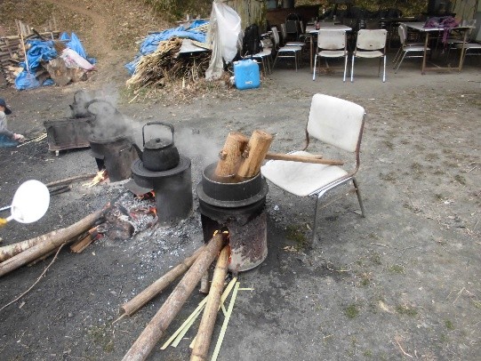 翌週に開催する餅つきに向けて、猪に荒されていた広場の地ならしを行い、使用する釜、鍋等の確認をして、更には薪づくりに汗を流しました。