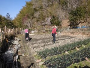 畑ではニンニクの芽が出てきて大きく成長しました。ありがたく収穫しました。掘り上げて乾燥させていたタマネギとともに参加者へのお土産としました。サツマイモ畑の草取り、サトイモ畑の藁敷き、電柵下や田の土手等の草刈りを行いました。
