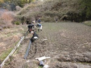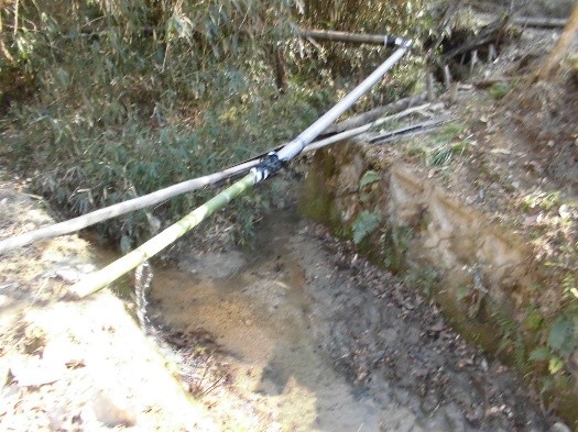 活動エリア南地域にある畑への導水路は、今まで竹をくり抜いて設置していましたが、経年劣化で割れてしまいました。このため塩ビ管に取り換えて再設置しました。